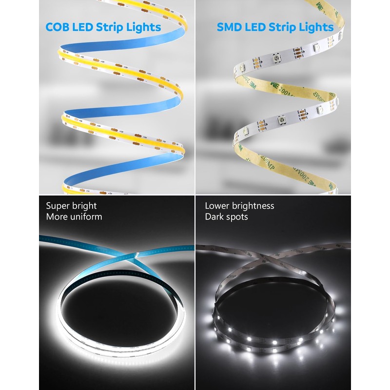 - DC 12V COB Led Strip Lights: 16.4FT 5M 6000K, CRI>85, 320leds/m, Cool White, Compared with ordinary light strips, it have more densely distributed LED chips, which creates brighter, softer, spotless and more uniform glow. It is the first choice for modern lighting and indoor decoration. Note: Not included LED controller or power supply
