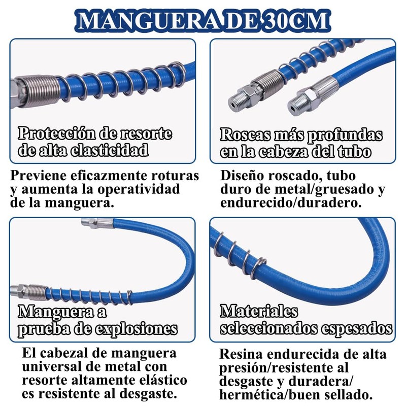 - Manguera Flexible De 30 CM: Incluye una manguera flexible de 30 cm, ideal para alcanzar zonas difíciles en vehículos, maquinaria agrícola o equipos industriales. La manguera es resistente y duradera, garantizando un uso prolongado.