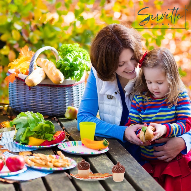 - Each one measures approximately 2 inches high and 1.5 inches wide. The acorns sit on a 5 inch wide leaf shaped tray.