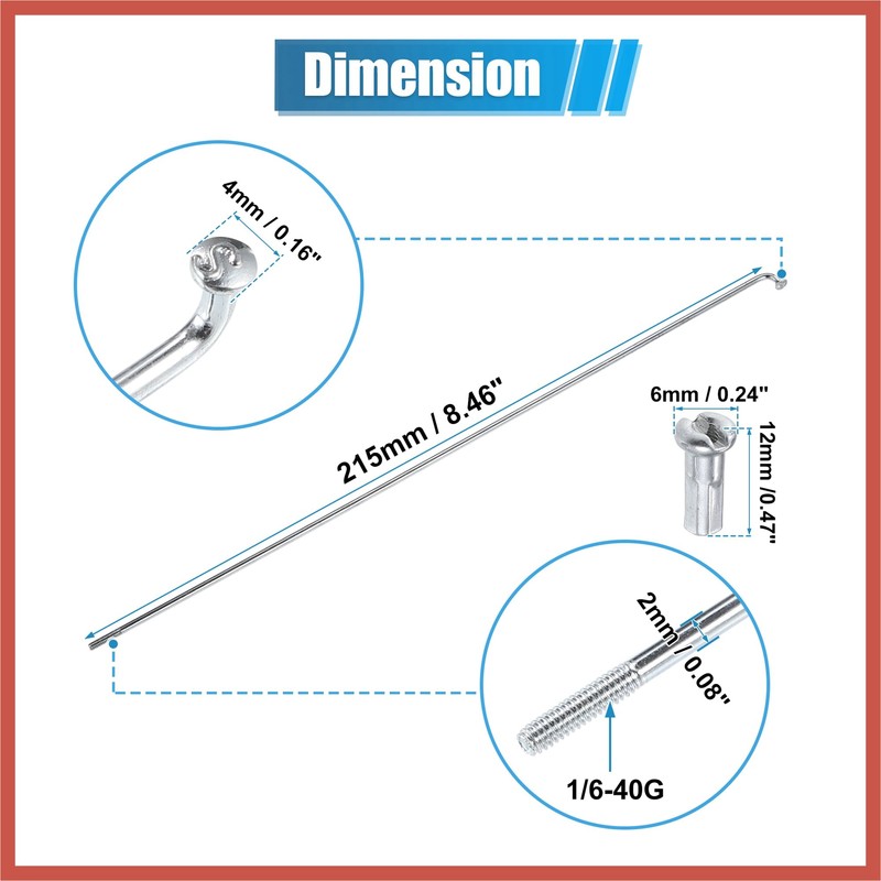 - Car Accessories: Dimensions: Spokes Size: 218x7mm / 8.58"x0.28"(L*W), Spokes Shaft Dia.: 2mm / 0.08", Thread Size: 1/6-40G, Elbow Head Dia.: 4mm / 0.16", Spokes Length(without Elbow): 215mm / 8.46", Nipple Size: 12x6mm / 0.47" x 0.24" (L*D)