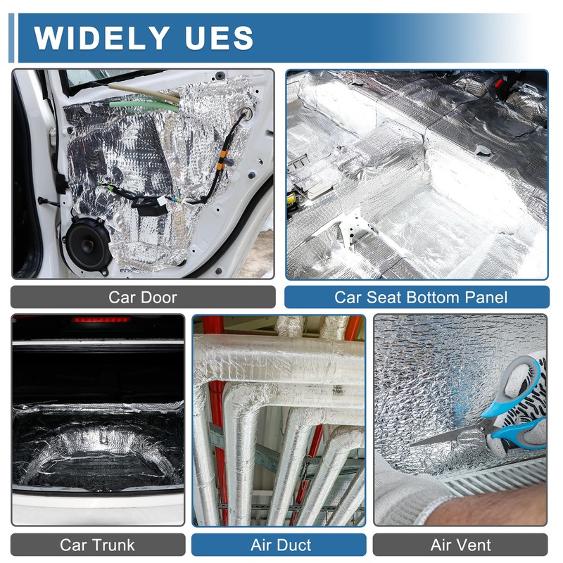 • Good Replacement: For Car, Boat and Golf Cart, such as hood, door, wheel arch, engine compartment, engine bays and body panels. Sound heat deadener insulation also fit for firewall, U type pipe, kitchen sink and computer case