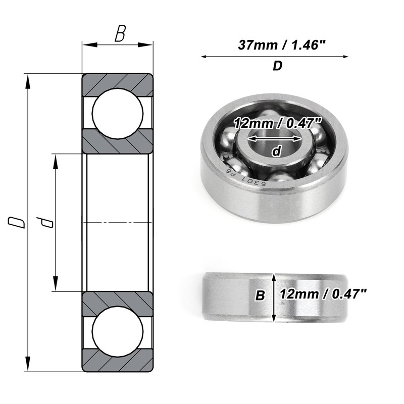 - Specification:Outer Diameter: 37mm / 1.46", Inner Diameter: 12mm / 0.47", Width: 12mm / 0.47", Type: 6301, Precision Level: P6, Basic Load Ratings (kN): Cr:9.7 C0r:4.2, Limiting Speeds(min-1): Grease:20000 Oil:24000