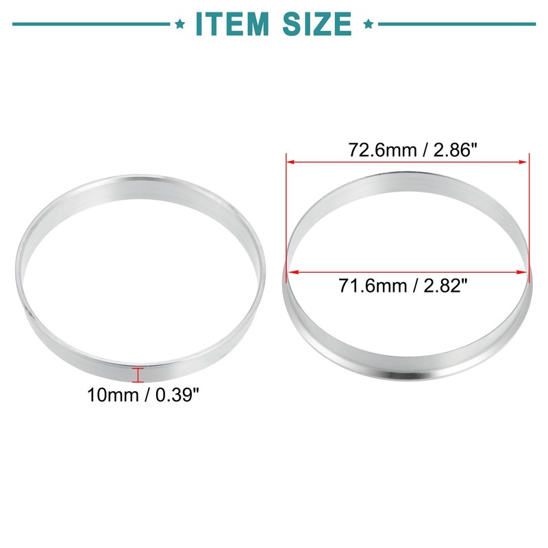 - Universal Fit: 4 pcs Universal Aluminum Alloy Hubcentric Rings. Designed to correct minor wheel and hub dimensions. Fit for any vehicle with a 71.6mm hub that needs to adapt a wheel with a 72.6mm center bore (OD=72.6mm, ID=71.6mm)