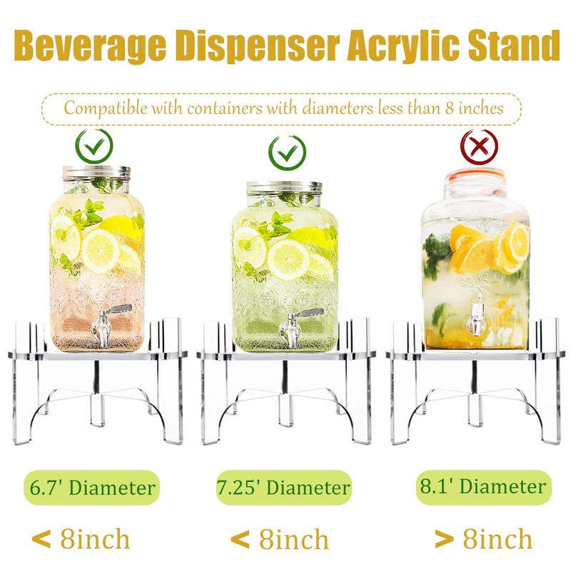 - NATURAL ACRYLICBEVERAGE STAND: 2 Pack acrylic holder for beverage dispenser, Designed to fit beverage dispensers with up to 8-inch diameter base, dispenser stands perfect for standard glass drink dispensers (please peel off the film along the label before use)