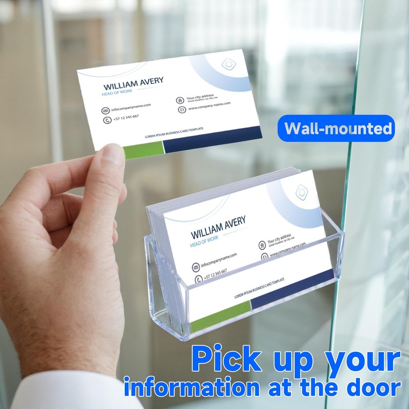 - 【Effortless to Install】Acrylic name card holder is equipped with double sided adhesive dots, you can directly fix the card holder stand on the desk; You can also use your own nails, screws, silicone, or glass adhesive to fix the business card holder to the wall