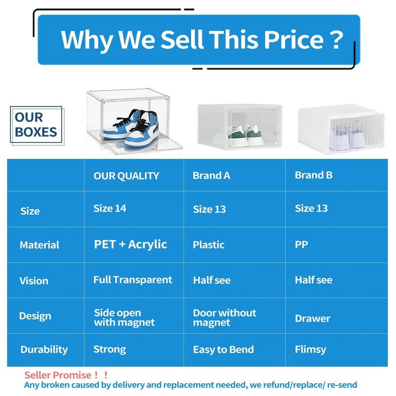 - Clear Box After-sales: Please check the corresponding shoe box size before you purchase the dispalying box. The delivered crack shoe box, replacement, or any boxes you are not satisfied, pls contact us. We will refund, resend or replace the replacement