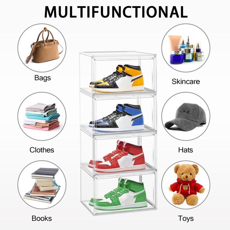 - Save Your Money - Display Storage Bins: We promise these clear cases & bins are not the plastic flimsy shoe boxes. We offer high quality Acrylic type display box. More strong and stable than the plastic soft box. No Deformation, No Smell, Water-Proof. These Shoe Storage Bins can use for a long time compared with the plastic box. More environment-friendly and save your money!