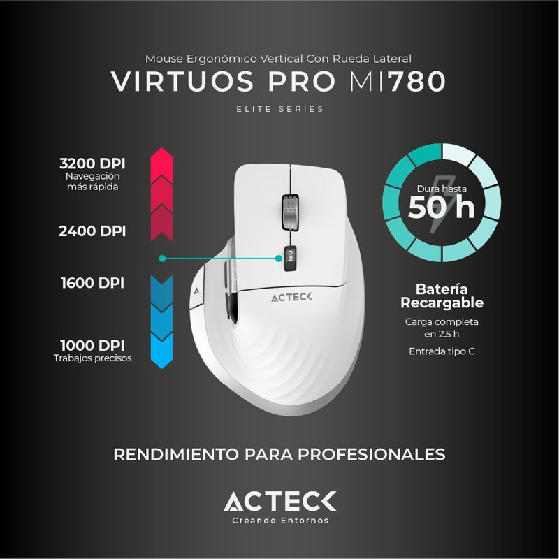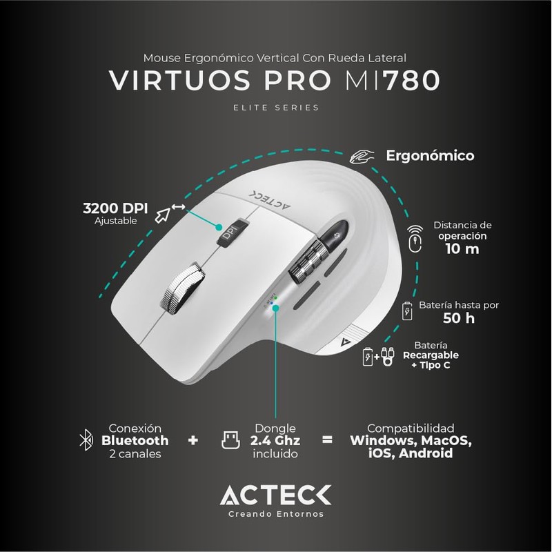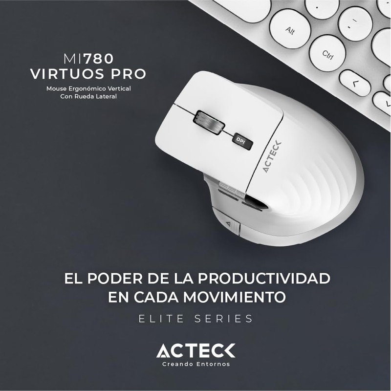 Acteck Mouse Ergonomico VIRTUOS Pro MI780 3000dpi Inalambrico 8 Botones Blanco AC-936194