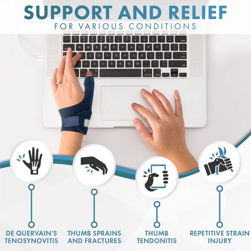 • RELIEF & SUPPORT - This thumb splint supports injured thumbs and alleviates pain caused by a range of conditions including sprains, thumb tendonitis, de quervain's, fractures, and RSI.