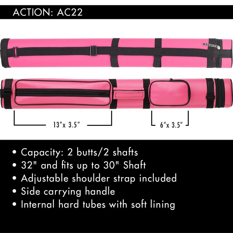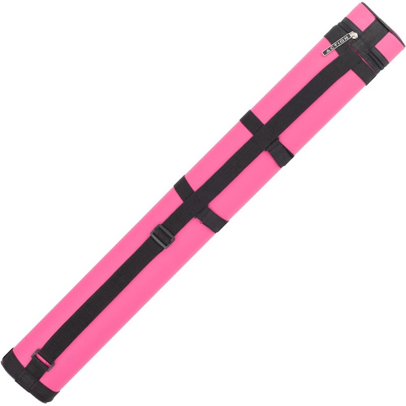 Action 34" Long Pool Cue Hard Carrying Case - Holds 2 Butts & 2 Shafts, Separate Molded Tubes, Large Zippered Accessory Pockets, Adjustable 1" Vinyl Carrying Strap, Fits up to 32" Shaft or Butt, Pink