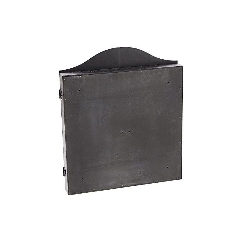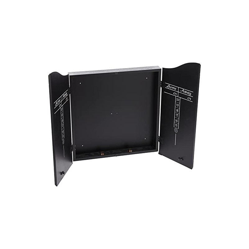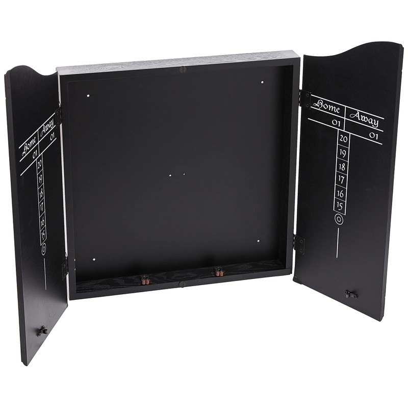 The Black Canyon Black Dart Board Cabinet. MDF Construction. Decorative routing on each door panel. Scoreboards inside each door panel. Inside Dimensions: 18.5" W x 18.5" H x 2" D. Compatible with any official size bristle board (not included). Mounting Hardware included.