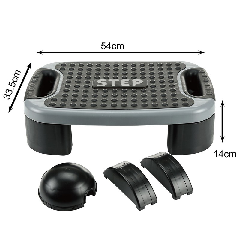* Board dimension: L:21" x W:13" x H:5.5" * Color: Gray and Black * Easy to adjust functions as Aerobic Step, Push-Up Board, Stretch board, Foot Stretch, Balance Board * Slip resistant top which provides you with a firm. Solid fundation is safe and comfortable in workout * Portable and easy to strore.
