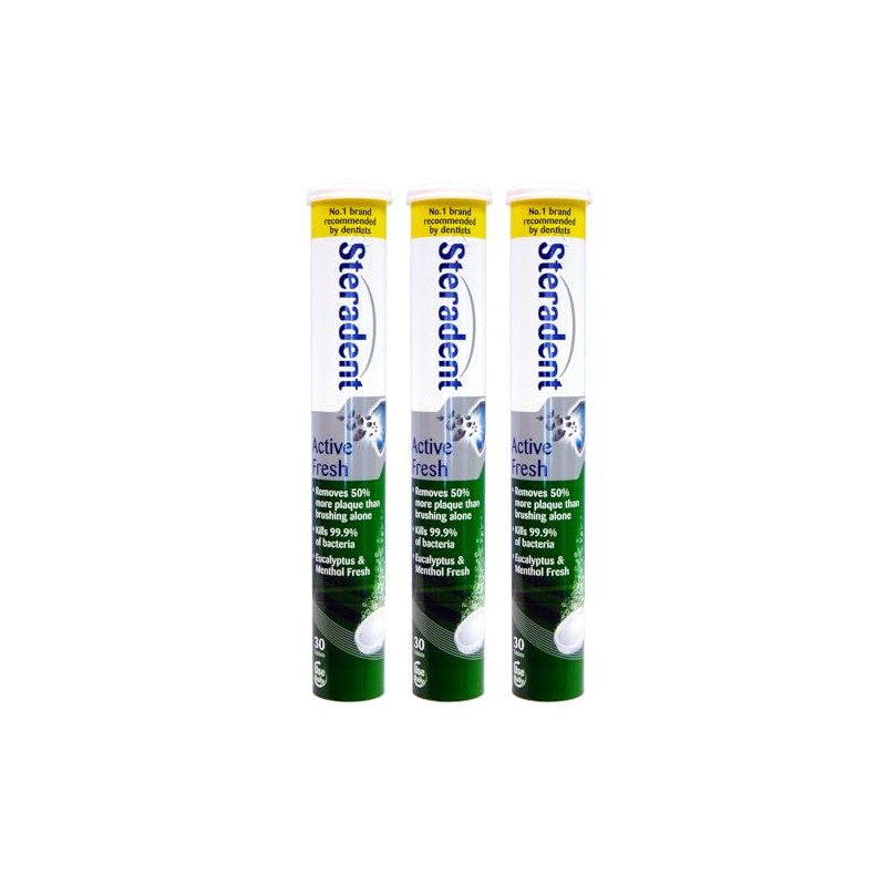Active Fresh Denture Cleaning Tablets – Eucalyptus & Menthol – 30 Tablets x 3 Pack – Helps Remove Plaque & Stains, Provides Long-Lasting Freshness, Suitable for Full & Partial Dentures