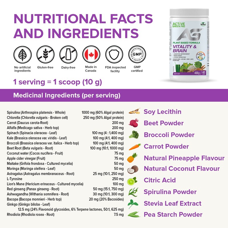 Active Green Pro - Vitality & Brain Powder, Blend of Synergistic Herbs, Lion's Mane, Ginkgo, and Vegetables, Plant-Based Formula, No Fillers, No Sugar Added - 40 Servings