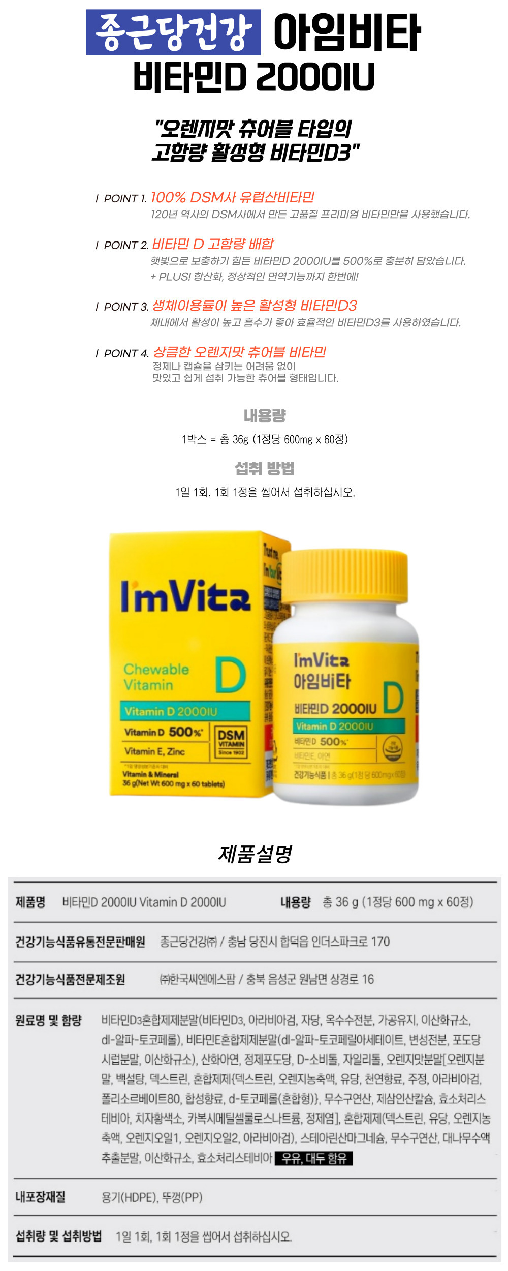 Active vitamin vitamin D chewable I'm Vita antioxidant zinc absorption intake sunlight vitamin D 2000IU high content home shopping elderly intestines / 활성형비타민 vitaminD 츄어블 아임비타 항산화 아연 흡수 섭취 햇빛 비타민D2000IU 고함량 홈쇼핑 노인 장