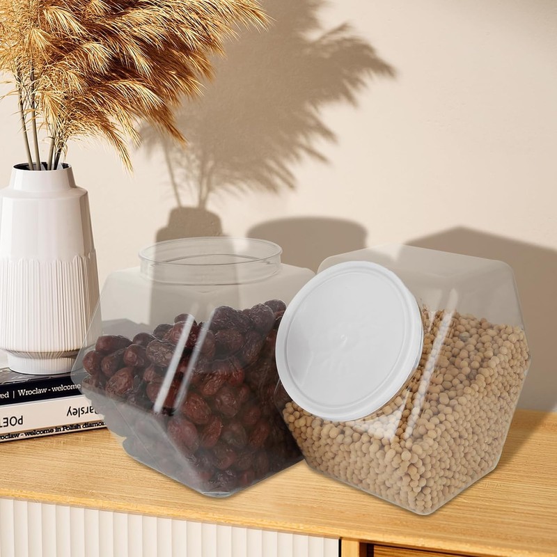 - Personalized Design:These plastic dry food jars feature a hexagonal body design that allows you to position the sides or bottom of the jar,making it easy and space-saving to store the jars on countertops,shelves,pantries,and other small areas.