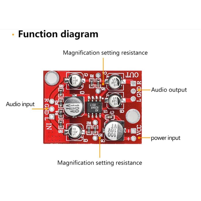 R7 and R5 are the magnification setting resistors (the default delivery is about 5 times magnification, you can change the magnification according to your own needs, the resistance can be selected from 5k-47k, the greater the resistance, the higher the magnification, if you use plug-in resistors , You can remove the original chip resistor and solder the plug-in resistor on the pads reserved at both ends of the chip position)