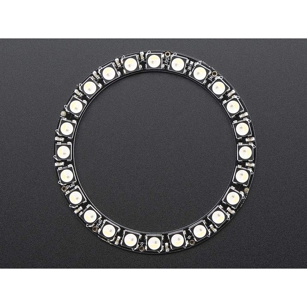 24 ultra bright smart LED NeoPixels are arranged in a circle with 2.58" (65.5mm) outer diameter. The rings are 'chainable' - connect the output pin of one to the input pin of another. Use only one microcontroller pin to control as many as you can chain together! Each LED is addressable as the driver chip is inside the LED. Each one has ~18mA constant current drive so the color will be very consistent even if the voltage varies, and no external choke resistors are required making the design slim. Power the whole thing with 5VDC and you're ready to rock.