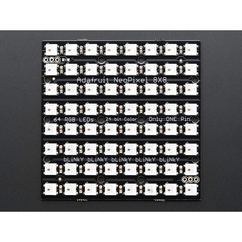 Put on your sunglasses before wiring up this LED matrix - 64 eye-blistering RGB LEDs adorn the NeoMatrix for a blast of configurable color. Arranged in an 8x8 matrix, each pixel is individually addressable. Only one microcontroller pin is required to control all the LEDs, and you get 24 bit color for each LED.