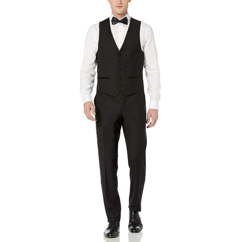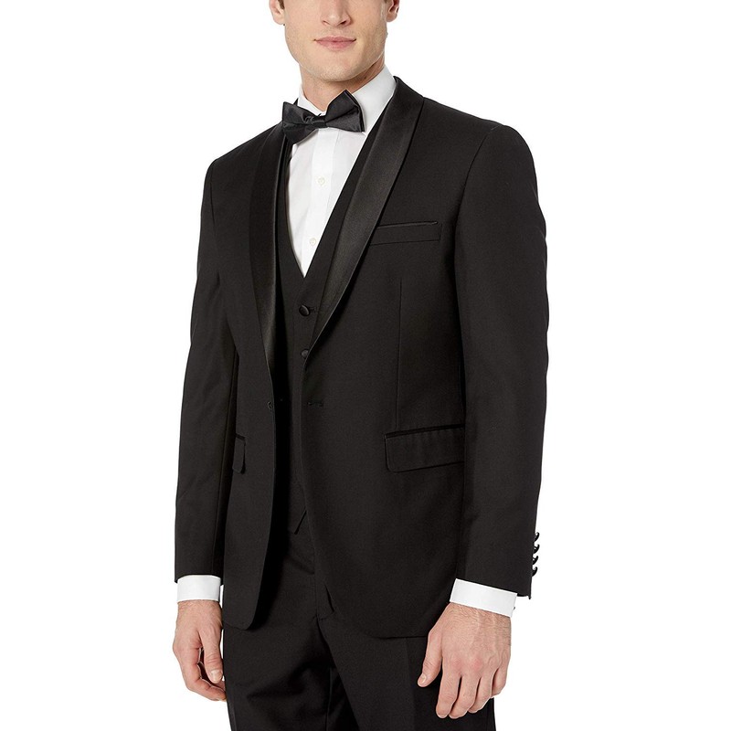 - Jacket: Modern Fit, Shawl Collar, Single Breasted, One-Button Closure, Black Satin Shawl Collar, Two Front Welt Pockets with Black Satin Besom, Chest Pocket, 3 Interior Pockets, Double Side/Back Vents, Fully Lined, Button Detail on Sleeve. Interior. VEST: Single Breasted 5 Button Closure, Fully Lined, Adjustable Back Strap