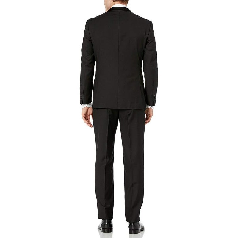 - Jacket: Modern fit, satin notch lapels, single breasted, two-button closure, two front flap pockets with black satin besom, chest pocket, 3 interior pockets, double side/back vents, fully lined, button detail on sleeve: Vest: single breasted 5 button closure, fully lined, adjustable back strap