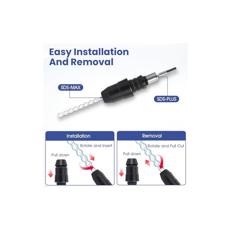 - 【Fácil instalación y extracción】El adaptador SDS Max a SDS Plus es fácil de instalar y quitar. Simplemente inserte la broca, gírela a la ranura correcta y presione hacia abajo. Para eliminar, tire hacia abajo el adaptador SDS Plus a SDS Max y sáquelo después de un clic, cambiando rápidamente de tareas. Ahorra tiempo y energía, lo que te proporciona una experiencia de uso eficiente y rápida
