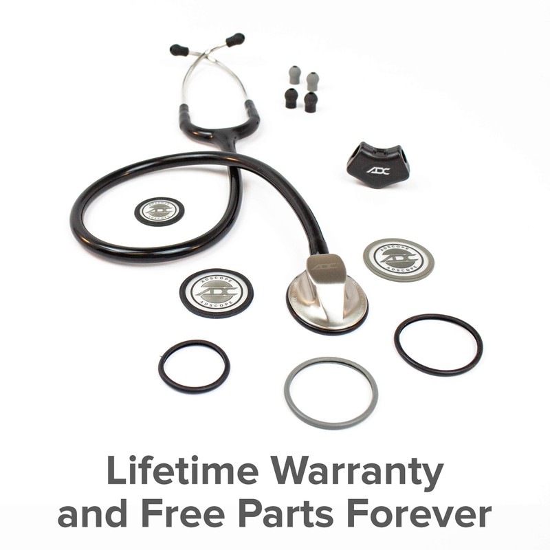 The ADC Adscope 615 Platinum Professional Clinician Stethoscope with AFD Technology combines the acoustic response of a traditional bell and diaphragm in a convenient, oversized, one-sided chestpiece. Use light pressure for low, bell-type frequencies, and firm pressure for high, diaphragm-type frequencies. The clinician headset features reinforcing yoke molded into flexible phthalate-free PVC tubing, stainless binaurals, and Adsoft Plus snap-on silicone eartips for the ultimate in wearing comfort and acoustic seal. Includes a scope ID tag and two additional pairs of Adsoft Plus eartips in a convenient storage case. Lifetime warranty and free parts forever.