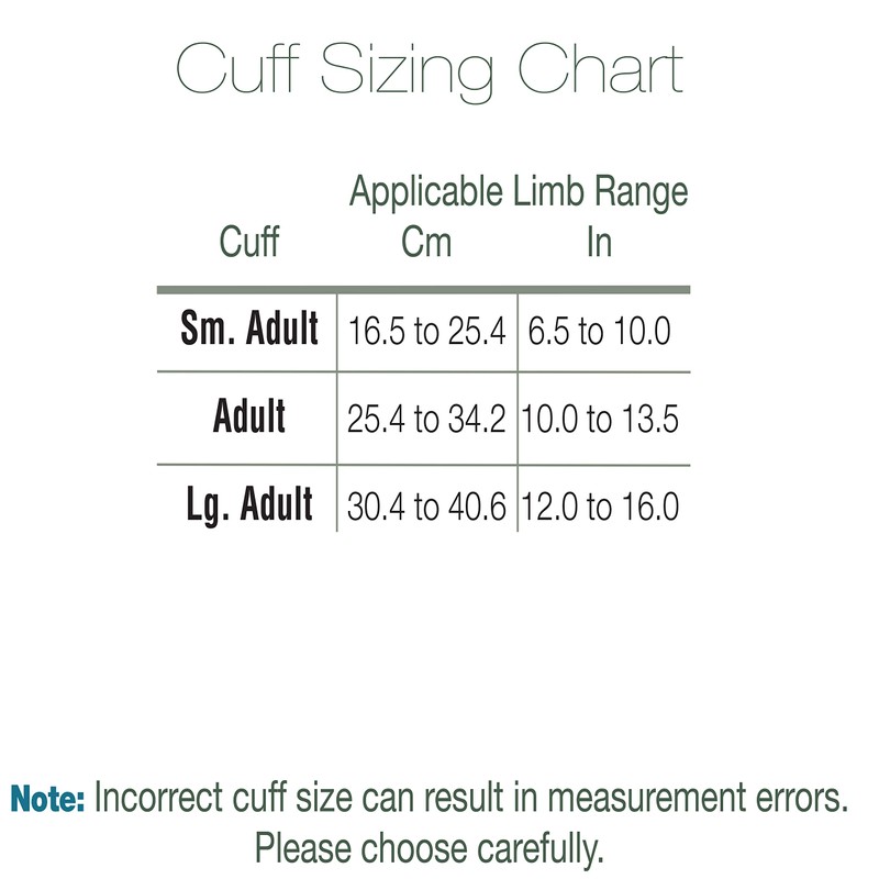 - Self-adjusting, nylon D-ring cuff for one-handed application; includes attached, diaphragm-only stethoscope. Large adult fits limb ranges from 30.0 cm to 40.0 cm (11.8" to 15.7").