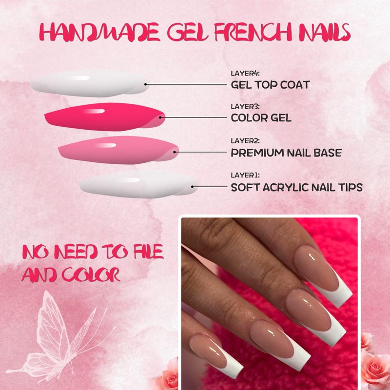 - Convenient square french tip nails: Nude french press nails long are packaged with a clear plastic case, long french tip press on fake nails are square shaped, long length full nails with white french design, no polish and painting needed, can meet all your different needs, whether you want at home nail care, DIY nails extensions, saving money on salon visitor, convenient for travel, which are perfect for any occasion