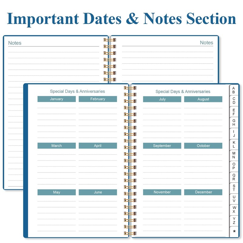 This address book allows you to store all your address, telephone, birthday, specila dates & web login password.The information used to protect you will never be forgotten. The address notebook cover is lovely teal look, golden spiral bound design. The telephone address & birthday book size of 4.3" x 6.2" , is used to high quality 120gsm pure white paper for easy writing and reducing ink leakage. A total of 64 sheets(128 pages) 1 person infomation page, 12-month special days & anniversaries, 3 entries per page for telephone, address & birthday, total 291 entries, 4 entries per page for password, 10 pages, total 40 entries for password, and 10 pages notes section. make sure you have enough space for you record important information. Spiral bound address organizer book with alphabetical tab you can locate need addresses quickly