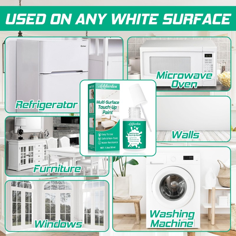 Our white paint is suitable for a variety of surfaces, whether it is walls, doors, tiles, furniture, or appliances, this touch up paint can easily cover scratches, stains, cracks, chips and other surface defects, perfectly repairing walls, tabletops, door fronts, cabinets, refrigerators, etc. Our white wall paint dries in 1-2 hours, perfect for quick repairs. Once dry, our white paint forms a tough, durable coating that resists daily wear, scratches and fading, eliminating the need for frequent maintenance. Our tile paint is formulated with a premium water-based acrylic formula that applies smoothly, dries to a clean, even finish, and has excellent adhesion that allows it to blend seamlessly with the original surface. Our porcelain paint is low odor, quick-drying, stain-resistant, abrasion-resistant, and washable, making it completely safe to use around adults, children, and pets. Our cabinet paint comes with a built-in brush for precise application without additional tools. Only need to apply the wall paint evenly over the scratch, after drying, it will form a clean and flawless surface, saving time and repair costs.