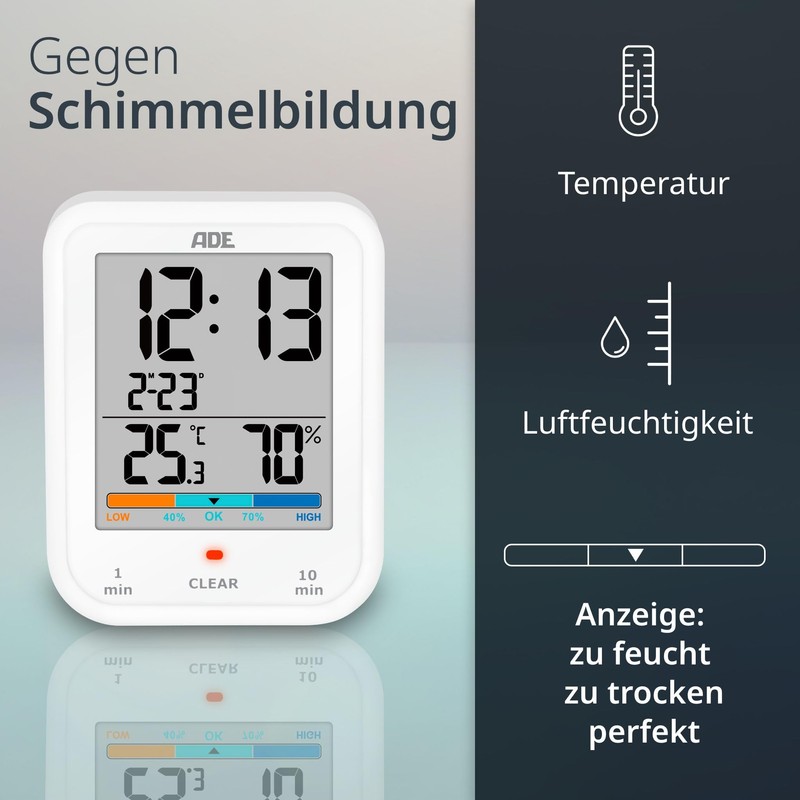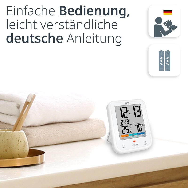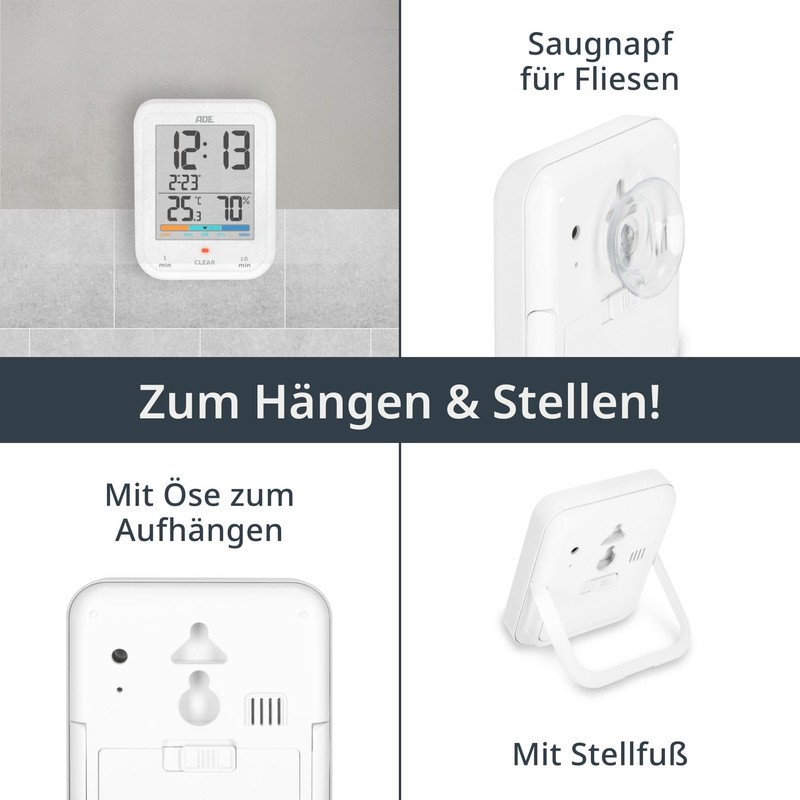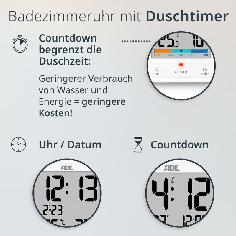 ADE Digital Bathroom Clock with Hygrometer and Thermometer, IP65 Waterproof, Shower Timer, Countdown Function, Large LCD Display, with Date Display, White
