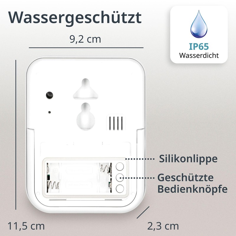 - Flexible placement options: rubberised suction base for wall mounting, hanging loop for hanging and adjustable base for standing. Dimensions: 9.2 x 11.5 x 2.3 cm. Batteries included (2 x AAA)
