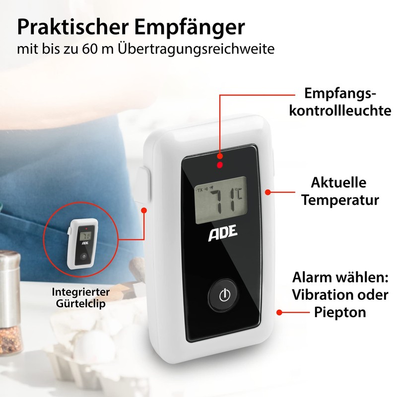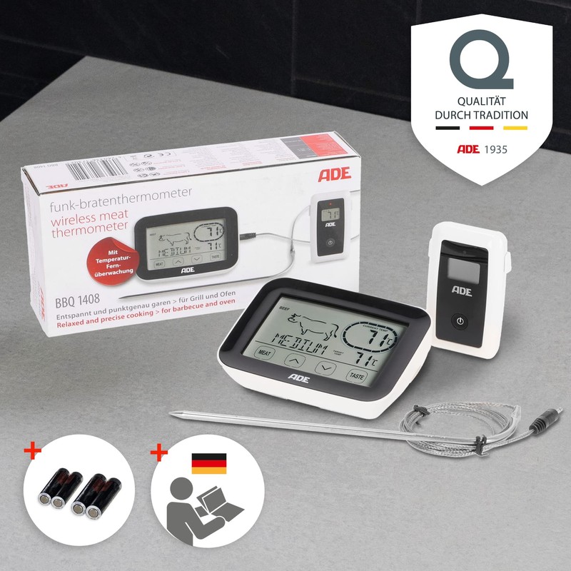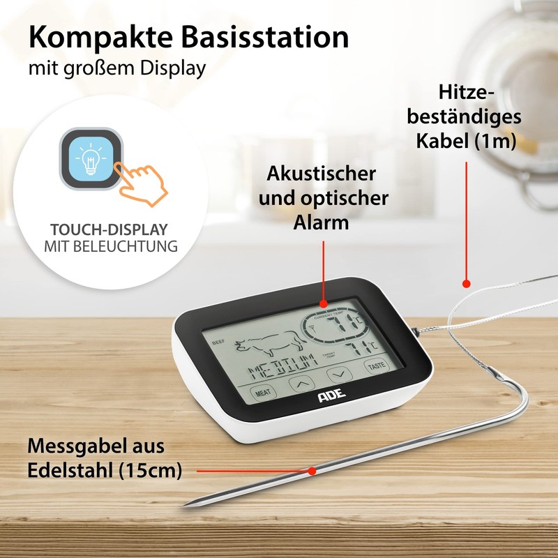 ADE Funk-Bratenthermometer | Digitales Grill-Thermometer mit Touch-Display, Funkempfänger, Messgabel aus Edelstahl | Elektronisches Ofenthermometer mit Garprogrammen | Inkl. Batterien