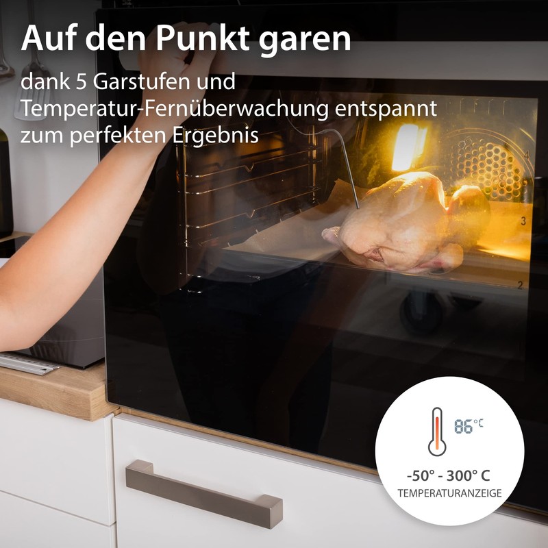 - Pre-selection of meat, beef, laMB, veal, pork, chicken, turkey, minced meat) and core temperatures (selectable ° C or ° F) after cooking levels or Individual Temperaturvorgabe at the base Station