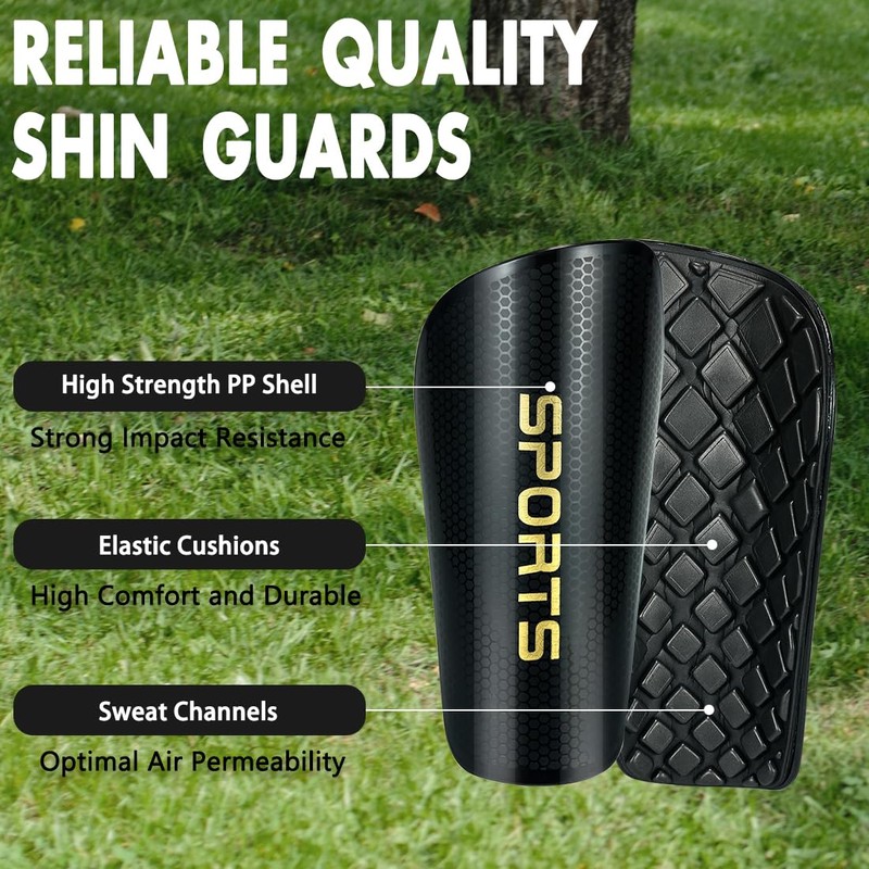 - PREMIUM MATERIAL: The soccer shin guards are created with high strength PP shell, which helps reduce impact on calf efficiently. The comfort thickly padded inside with the small elastic cushions against the impacts and guarantee optimal air permeability