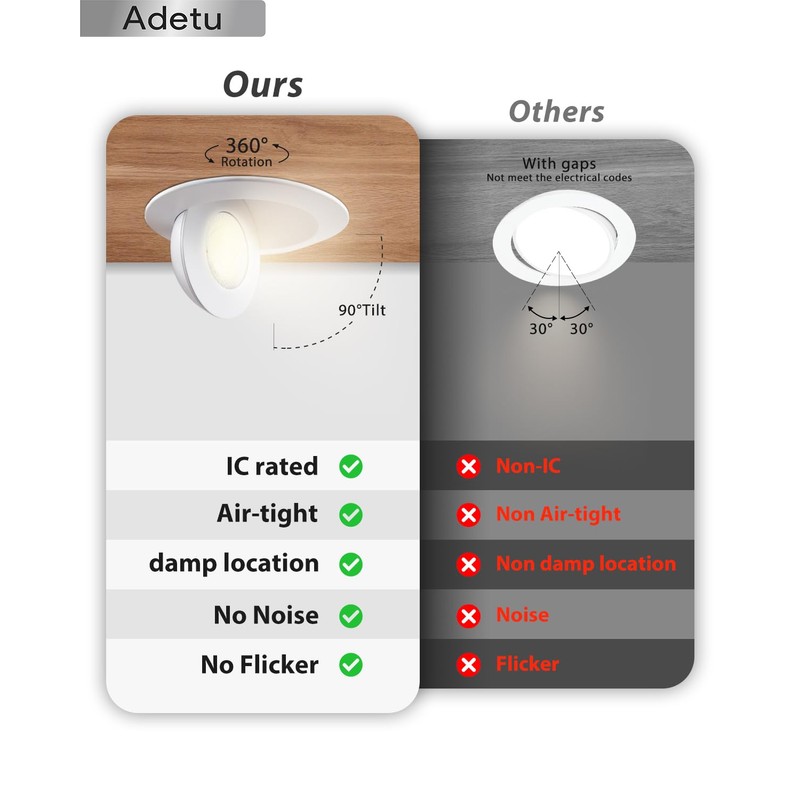 • ✅【360°+90° Adjustable】Adetu 6 inch gimbal led recessed lights can 360°Adjustable and up down 90°