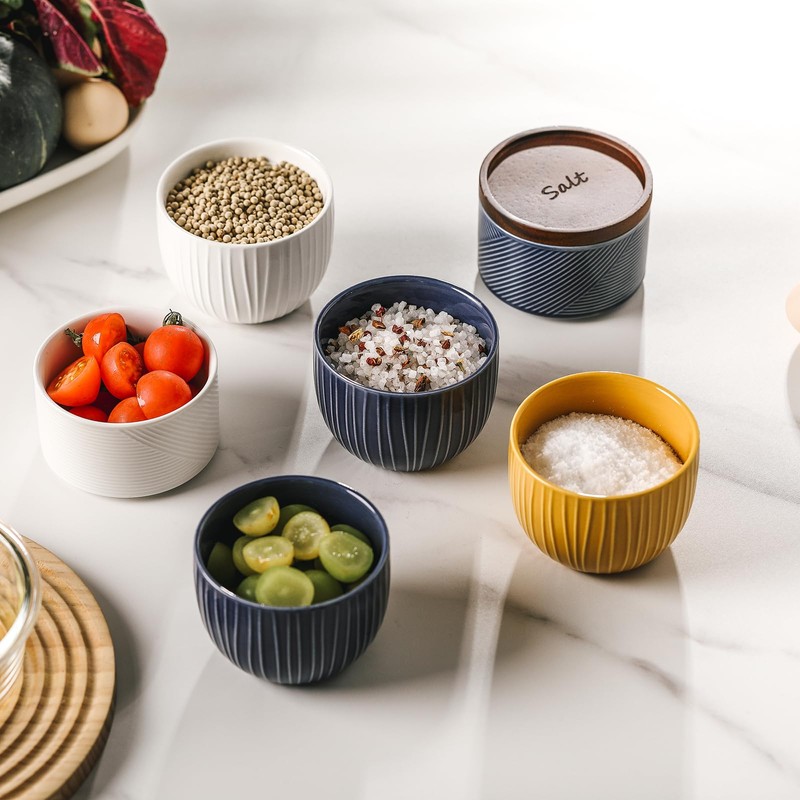 Adewnest Ceramic Salt and Pepper Bowl: 10 oz Farmhouse Style with Removable Wooden Lid - Stackable - Dishwasher Safe - Navy & Yellow