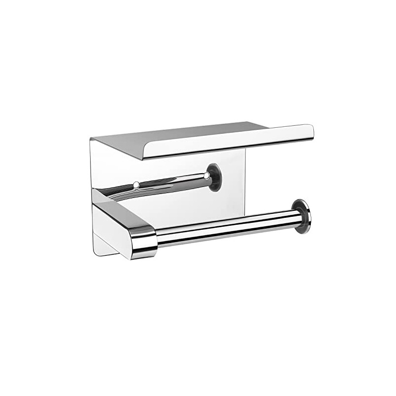Adhesive Toilet Paper Holder with Shelf Wall Mounted, SUS304 Stainless Steel Toilet Paper Roll Holder, Mega Roll Tissue Roll Paper Dispenser, No Drilling or Wall Mounted with Screws (Polished Chrome)