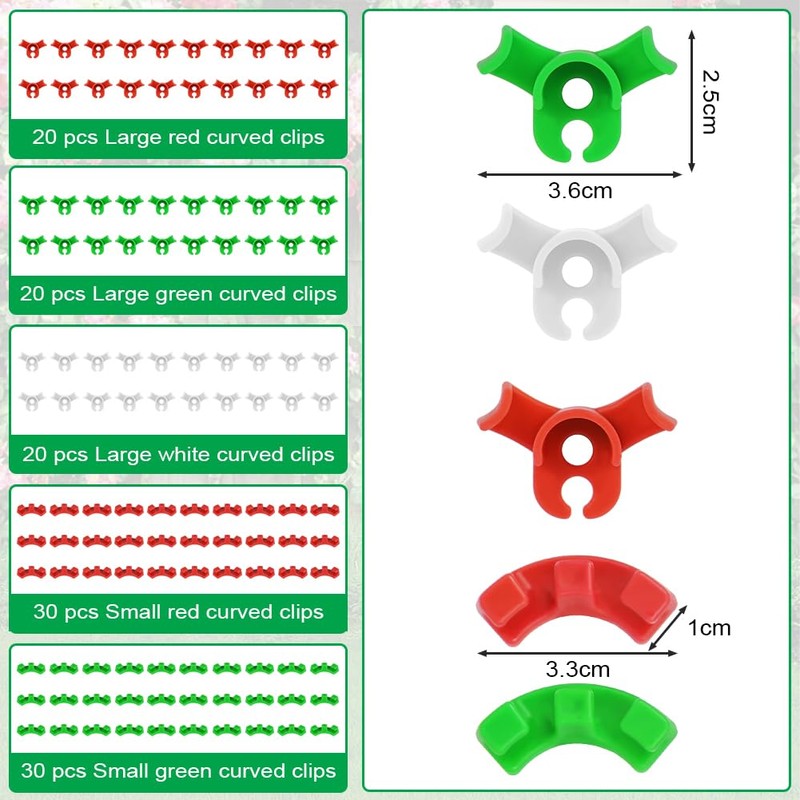 - 【Plant Bending Clips】The package of 90 degree angle plant support clips contains 120 pieces large and small plant bending clips (red, green, white), the large size is 3.6 x 2.5 cm, the small size is 3.3 x 1.3 cm. Garden plant stem trainer, low load training clips for bending plant stems and changing the direction of growth, sufficient quantity to meet your daily plant care needs.