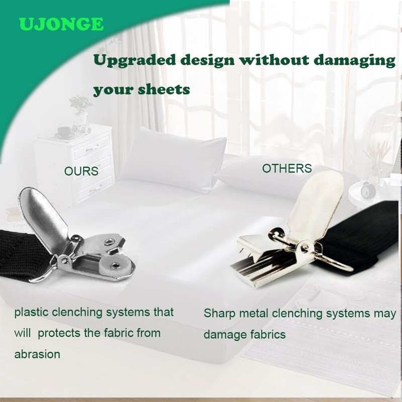 - Premium Quality: The bed sheet holder straps are made of premium-quality nylon and metal clips, the high-elastic fit for most fitted sheets and flat sheets. The bed sheet suspenders hold your sheets.