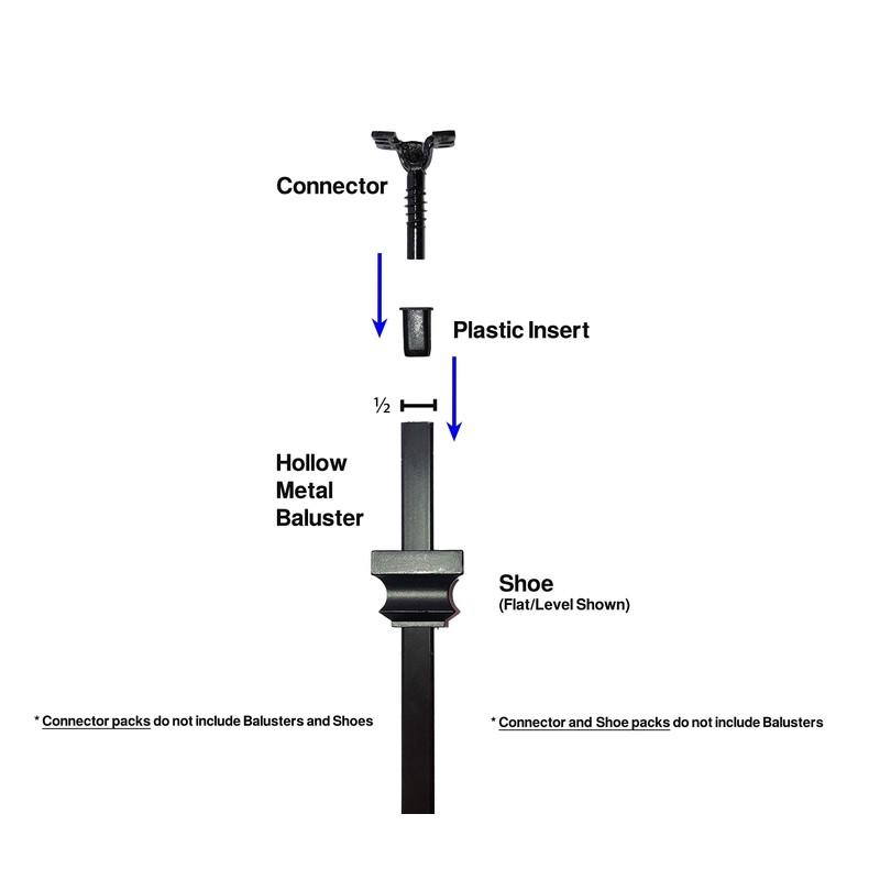 • Fits ½" Hollow Metal Balusters – Each connector inserts securely into both ends of standard ½" hollow metal balusters using durable plastic inserts and included mounting screws.