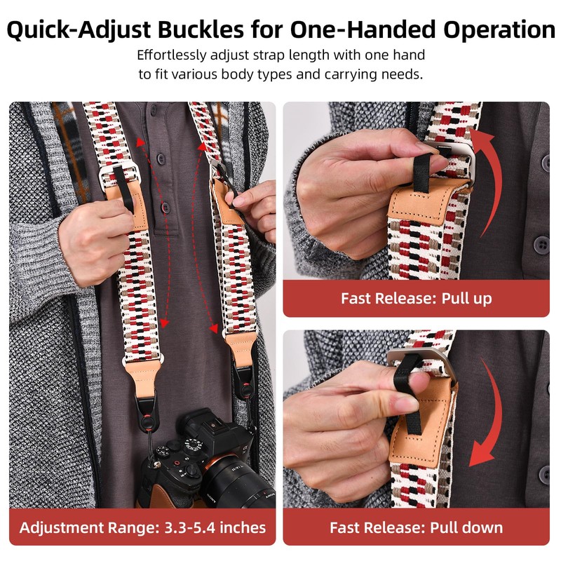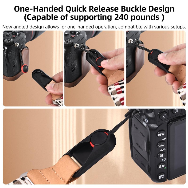 • Quick Release Buckle for Ultimate Convenience: This camera strap features an innovative quick release buckle that allows for effortless one-handed attachment and detachment, compatible with any shaped interface. Its strength is ten times that of steel, supporting up to 240 pounds, ensuring your camera's safety is always secure.