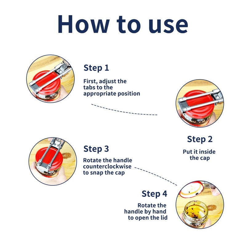 - Easy to use: the adjustable can opener is very easy to use. Adjust the buckle to the appropriate position and insert it into the bottle cap, turn the handle counterclockwise until the bottle cap is locked, and then turn the handle to open the lid, which is simple and lightweight.
