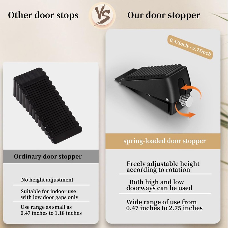 • Knob rotary adjustment design: large heavy-duty door stop with built-in spring design, the right screw is raised to fill the door gap, the left screw is lowered for easier removal, this door stop wedges at 2.75 inches high and fits door gaps from 0.47-2.8 inches