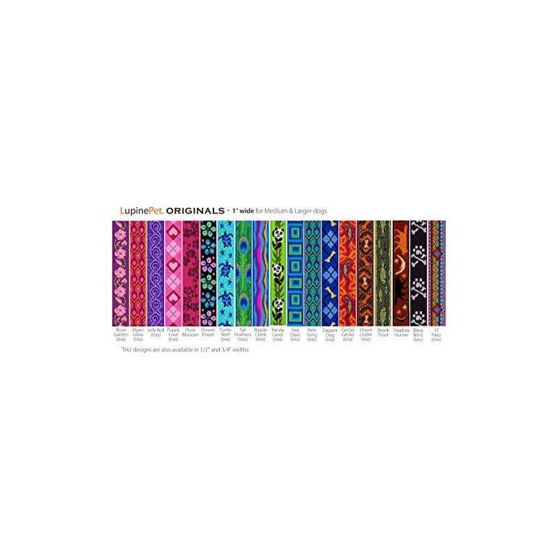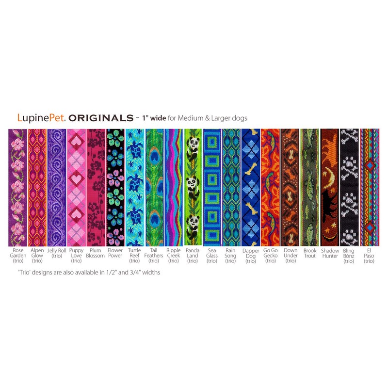 Lupine Originals are made from woven nylon in an array of colorful designs. The pattern is woven into the webbing, rather than printed or sewn on. Made with strong bar-tack stitching, welded steel hardware, and ends are turned under and stitched to protect fur and skin.