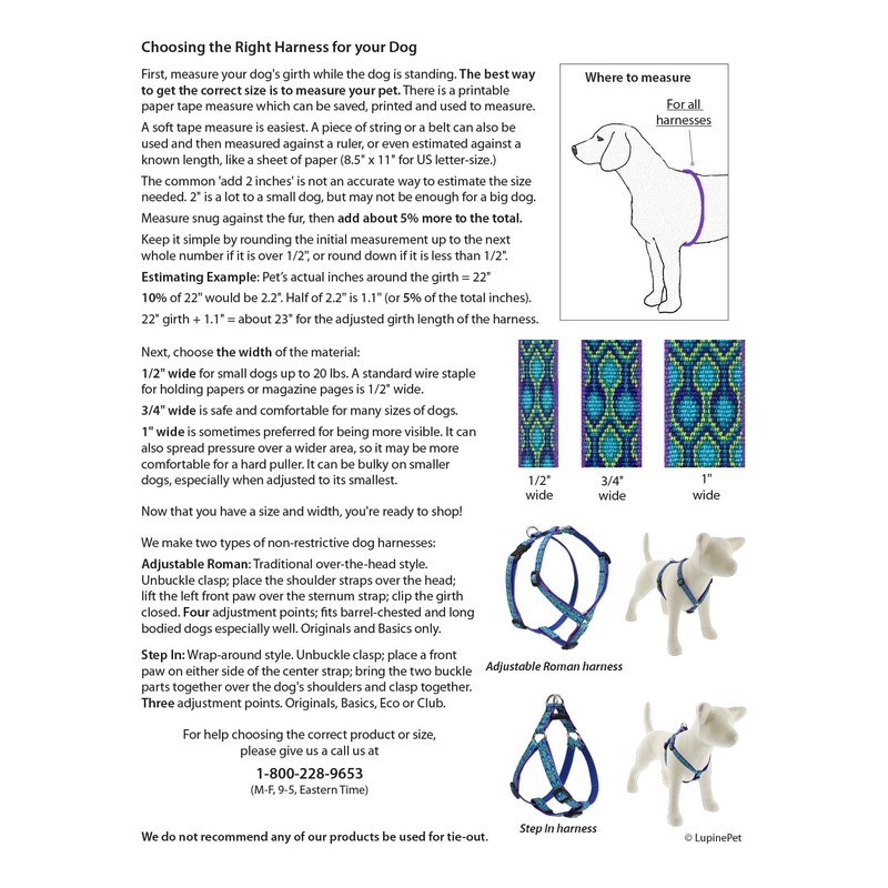 The Lupine Adjustable Step In harness is sized by the inches-around the dog's ribcage. To choose the correct size always measure around the body, just behind the front legs. Measure snugly, and then add an extra 5% to find the actual adjusted size of the harness girth. Or, measure the length of the girth strap from the dog’s current harness.