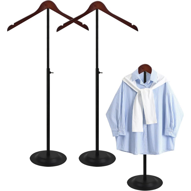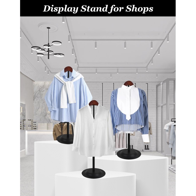 - HIGH QUALITY MATERIALS: T Shirt Display stand is made of metal and the metal base has a diameter of 9.5 inches, which provides a solid base and prevents shaking. The hangers are made up of wood with a width of 17 inches for a sturdy and durable quality; the use of these materials not only ensures the sturdiness and sustainability of the hangers, but also adds to their aesthetic appeal due to the predominantly brown color of the hangers.
