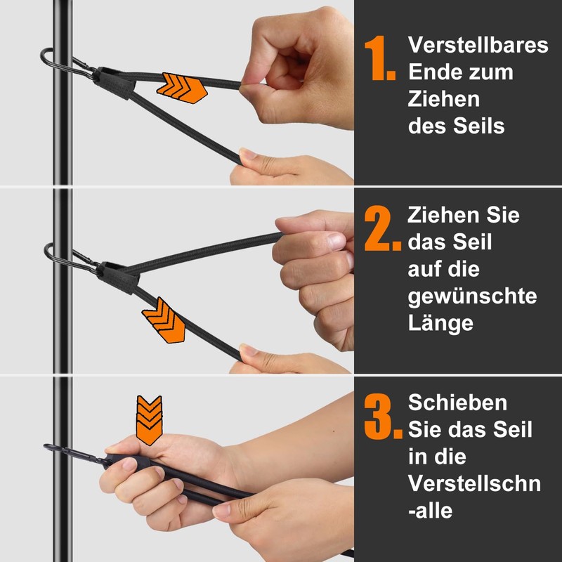 • Extremely elastic and adjustable: 4 pieces 100 cm long elastic straps with hooks that can be stretched up to 200 cm, the length can be adjusted to different lengths from 50 cm to 100 cm depending on the size of the item. These heavy duty bungees are compatible with bags of different sizes and weights