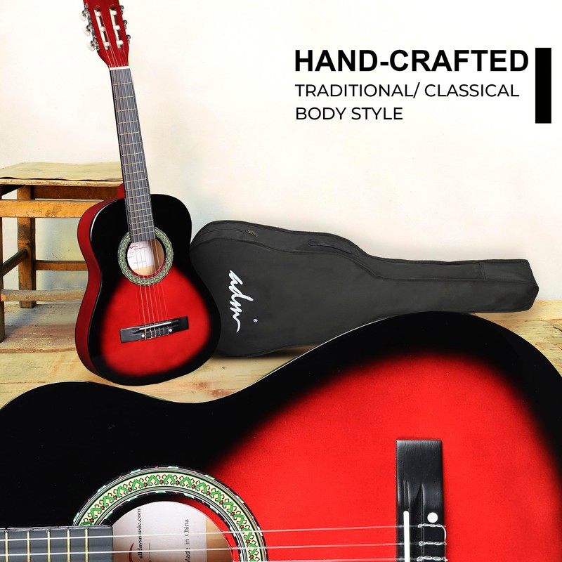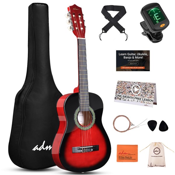 ADM Beginner Acoustic Classical Guitar Nylon Strings Wooden Guitar Bundle Kit for Kid Boy Girl Student Youth Guitarra Online Lessons with Gig Bag, Strap, Tuner, Strings, Picks (34 Inch, Redburst)